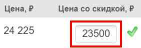 Для установки скидки на один товар введите цену напротив товара в поле "Цена со скидкой". Сохранение скидки происходит автоматически.