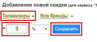 Вы желаете установить скидку на все телевизоры "-5%". В появившемся окне выберете категорию "Телевизоры", введите в поле "-5%" и сохраните.
